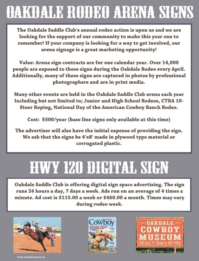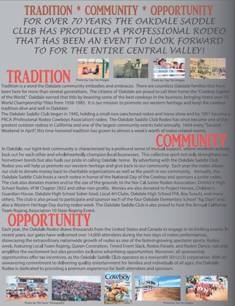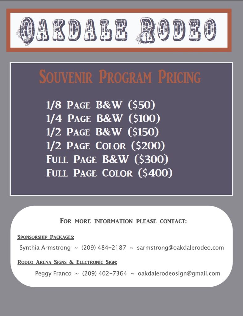 Sponsorship Package contact info:   Synthia Armstrong 209-484-2187 sarmstrong@oakdalerodeo.com